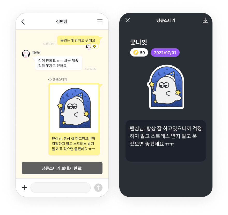 내 셀럽의 채팅방에서 + 버튼을 눌러 땡큐스티커를 보내 보세요
