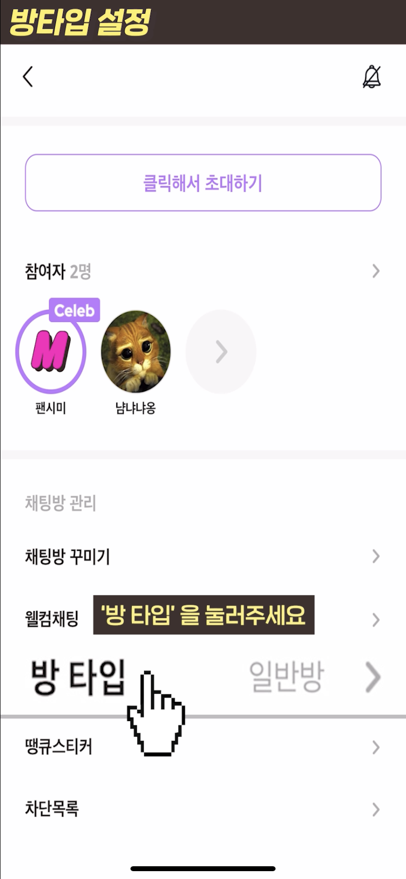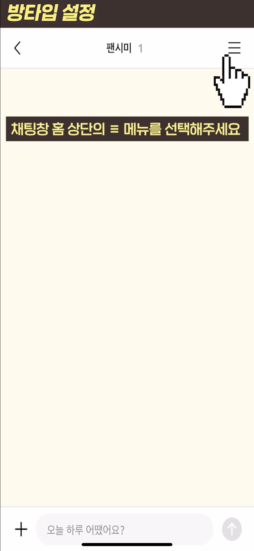 1. 채팅창 상단의[☰]메뉴 -> [방 타입]을 눌러주세요.