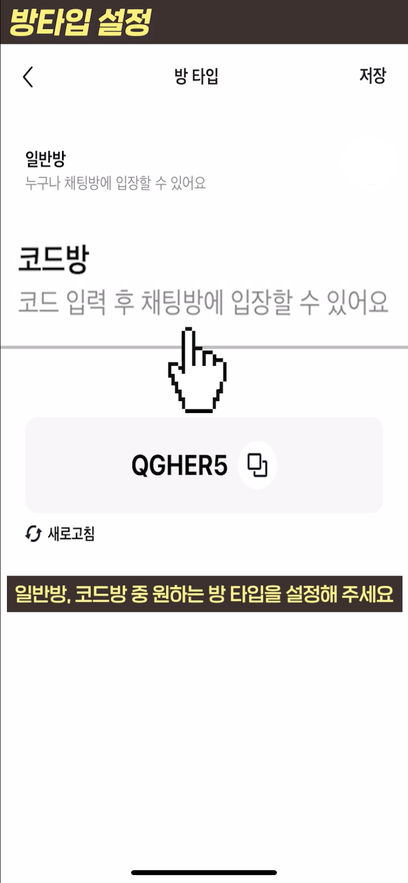 2. 일반방, 코드방 중 원하는 방 타입을 설정해 주세요.